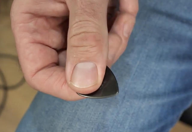 Manche legen das Plektrum eher parallel zum Zeigefinger und drücken den Daumen von der Seite darauf, ähnlich wie bei einem Stift. Das kannst du ausprobieren, entscheidend ist, dass es sich für dich gut anfühlt.
